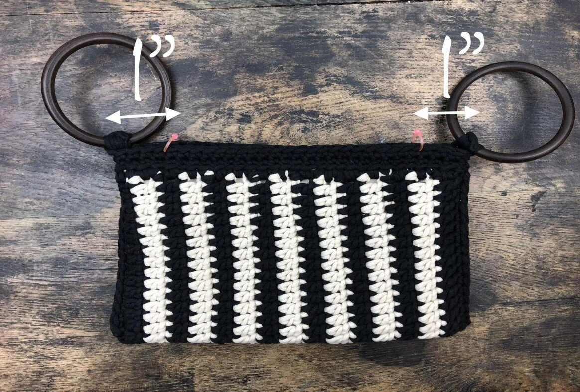 I added my bangles to both sides of the top of the bag by sc over the bangles and into the top corners in 3 stitches. See images for clarification.
